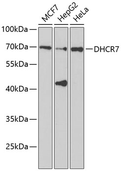Western blot analysis of extracts of various cell lines, using DHCR7 antibody at 1:1000 dilution.Secondary antibody: HRP Goat Anti-Rabbit IgG (H+L) at 1:10000 dilution.Lysates/proteins: 25ug per lane.Blocking buffer: 3% nonfat dry milk in TBST.Detection: ECL Basic Kit .Exposure time: 90s.