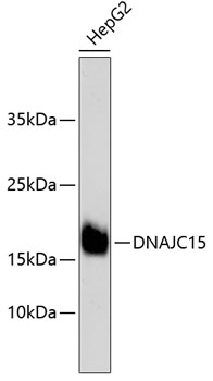 Western blot analysis of extracts of HepG2 cells, using DNAJC15 antibody .Secondary antibody: HRP Goat Anti-Rabbit IgG (H+L) at 1:10000 dilution.Lysates/proteins: 25ug per lane.Blocking buffer: 3% nonfat dry milk in TBST.