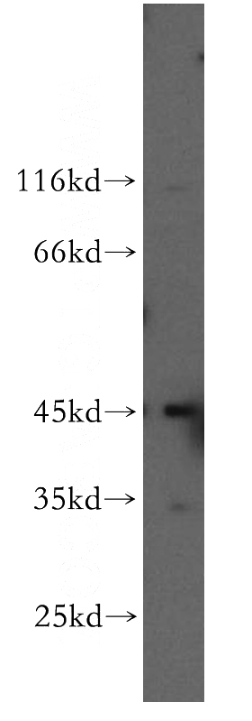 HeLa cells were subjected to SDS PAGE followed by western blot with Catalog No:109967(DNMT2 antibody) at dilution of 1:600