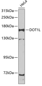 Western blot analysis of extracts of HeLa cells, using DOT1L antibody at 1:1000 dilution.Secondary antibody: HRP Goat Anti-Rabbit IgG (H+L) at 1:10000 dilution.Lysates/proteins: 25ug per lane.Blocking buffer: 3% nonfat dry milk in TBST.Detection: ECL Basic Kit .Exposure time: 90s.