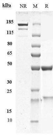 Anti-PCSK9 Antibody (ebronucimab) on SDS-PAGE under reducing (R) condition. The purity of the protein is greater than 95%.