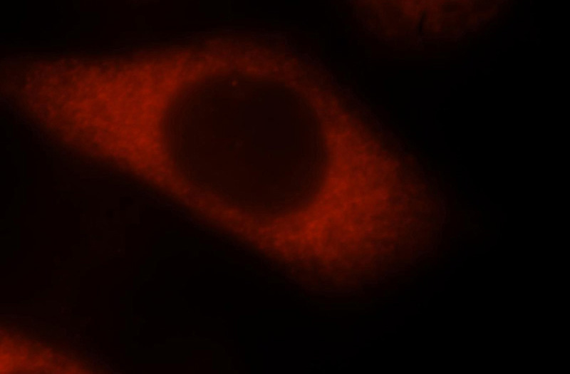 Immunofluorescent analysis of MCF-7 cells, using Catalog No:110313 and Rhodamine-labeled goat anti-rabbit IgG (red).