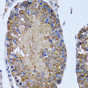 Immunohistochemistry of paraffin-embedded mouse testis using EIF2AK4 antibody at dilution of 1:100 (20x lens).