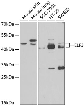 Western blot analysis of extracts of various cell lines, using ELF3 antibody at 1:1000 dilution.Secondary antibody: HRP Goat Anti-Rabbit IgG (H+L) at 1:10000 dilution.Lysates/proteins: 25ug per lane.Blocking buffer: 3% nonfat dry milk in TBST.Detection: ECL Basic Kit .Exposure time: 90s.