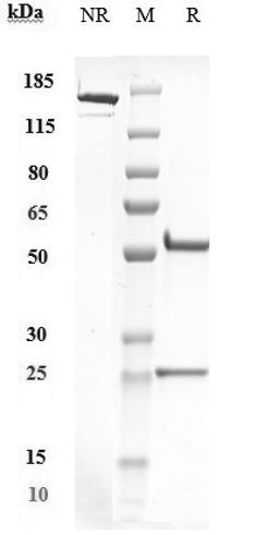 Anti-CSF1R / M-CSFR / CD115 Antibody (emactuzumab) on SDS-PAGE under reducing (R) condition. The purity of the protein is greater than 95%.