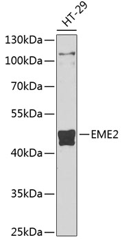 Western blot analysis of extracts of HT-29 cells, using EME2 antibody at 1:1000 dilution.Secondary antibody: HRP Goat Anti-Rabbit IgG (H+L) at 1:10000 dilution.Lysates/proteins: 25ug per lane.Blocking buffer: 3% nonfat dry milk in TBST.Detection: ECL Basic Kit .Exposure time: 15s.