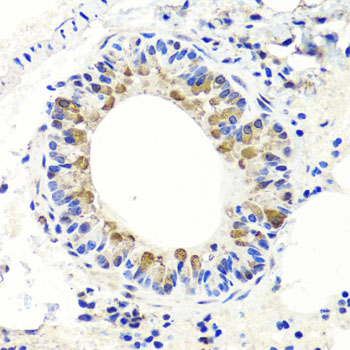 Immunohistochemistry of paraffin-embedded mouse lung using ENDOG antibody at dilution of 1:100 (40x lens).