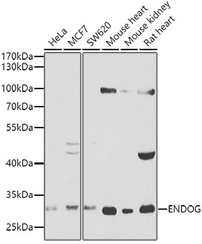 Western blot analysis of extracts of various cell lines, using ENDOG antibody at 1:1000 dilution.Secondary antibody: HRP Goat Anti-Rabbit IgG (H+L) at 1:10000 dilution.Lysates/proteins: 25ug per lane.Blocking buffer: 3% nonfat dry milk in TBST.Detection: ECL Basic Kit .Exposure time: 90s.