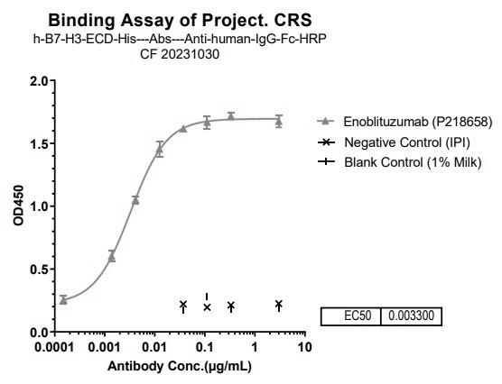 Immobilized human B7H3 His at 2 ug/mL can bind Anti-B7-H3 / CD276 Antibody (enoblituzumab), EC50=0.003300 ug/mL.