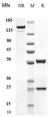 Anti-MU5AC Antibody (ensituximab) on SDS-PAGE under reducing (R) condition. The purity of the protein is greater than 95%.