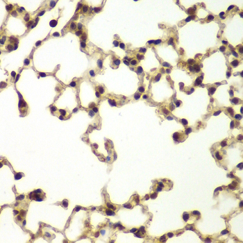 Immunohistochemistry of paraffin-embedded mouse lung using ERCC3 antibody at dilution of 1:200 (40x lens).