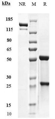 Anti-PCSK9 Antibody (evolocumab) on SDS-PAGE under reducing (R) condition. The purity of the protein is greater than 95%.