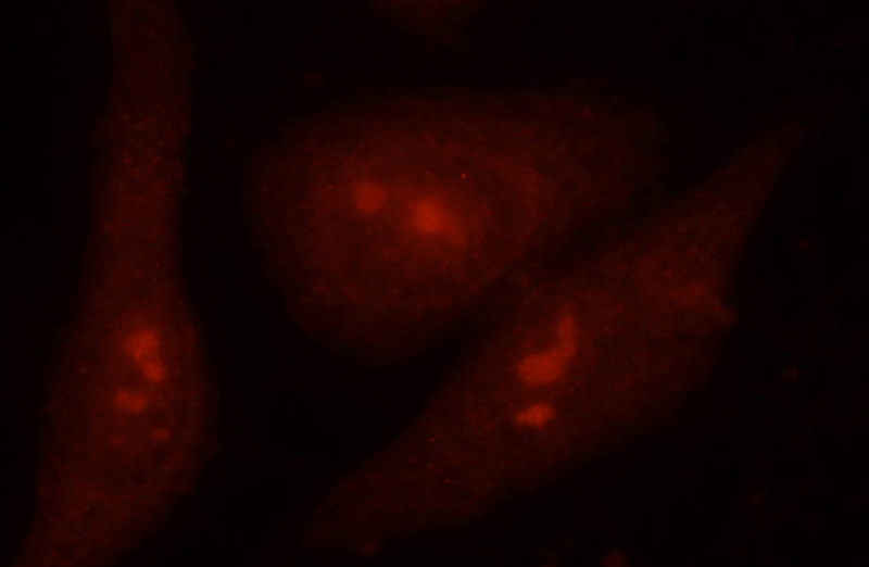 Immunofluorescent analysis of HeLa cells using Catalog No:110415(EXOSC9 Antibody) at dilution of 1:25 and Rhodamine-Goat anti-Rabbit IgG