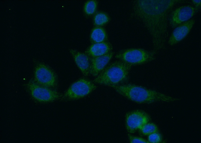 Immunofluorescent analysis of (10% Formaldehyde) fixed HeLa cells using Catalog No:110418(EXTL2 Antibody) at dilution of 1:50 and Alexa Fluor 488-congugated AffiniPure Goat Anti-Rabbit IgG(H+L)