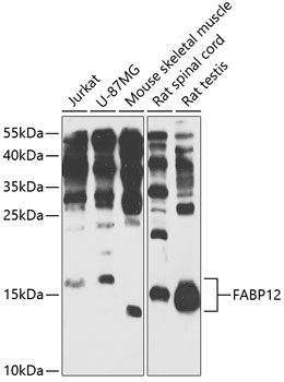 Western blot analysis of extracts of various cell lines, using FABP12 antibody at 1:1000 dilution.Secondary antibody: HRP Goat Anti-Rabbit IgG (H+L) at 1:10000 dilution.Lysates/proteins: 25ug per lane.Blocking buffer: 3% nonfat dry milk in TBST.Detection: ECL Basic Kit .Exposure time: 60s.