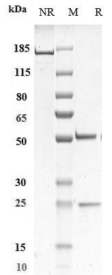 Anti-LAG3 / CD223 Antibody (favezelimab) on SDS-PAGE under reducing (R) condition. The purity of the protein is greater than 95%.