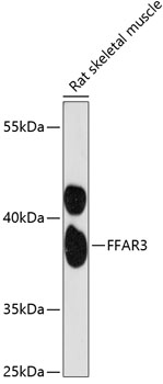 Western blot analysis of extracts of rat skeletal muscle, using FFAR3 antibody at 1:3000 dilution.Secondary antibody: HRP Goat Anti-Rabbit IgG (H+L) at 1:10000 dilution.Lysates/proteins: 25ug per lane.Blocking buffer: 3% nonfat dry milk in TBST.Detection: ECL Enhanced Kit .Exposure time: 60s.