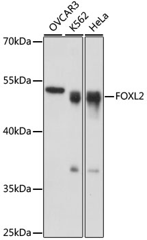 Western blot analysis of extracts of various cell lines, using FOXL2 antibody at 1:1000 dilution.Secondary antibody: HRP Goat Anti-Rabbit IgG (H+L) at 1:10000 dilution.Lysates/proteins: 25ug per lane.Blocking buffer: 3% nonfat dry milk in TBST.Detection: ECL Basic Kit .Exposure time: 1s.
