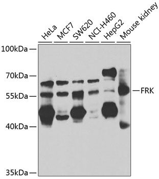 Western blot analysis of extracts of various cell lines, using FRK antibody at 1:1000 dilution.Secondary antibody: HRP Goat Anti-Rabbit IgG (H+L) at 1:10000 dilution.Lysates/proteins: 25ug per lane.Blocking buffer: 3% nonfat dry milk in TBST.Detection: ECL Basic Kit .Exposure time: 90s.