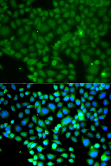 Immunofluorescence analysis of A549 cells using FRK antibody . Blue: DAPI for nuclear staining.