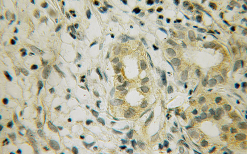 Immunohistochemical of paraffin-embedded human pancreas cancer using Catalog No:110779(FRZB antibody) at dilution of 1:100 (under 10x lens)