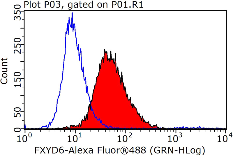 1X10^6 SH-SY5Y cells were stained with 0.2ug FXYD6 antibody (Catalog No:110757, red) and control antibody (blue). Fixed with 90% MeOH blocked with 3% BSA (30 min). Alexa Fluor 488-congugated AffiniPure Goat Anti-Rabbit IgG(H+L) with dilution 1:1000.