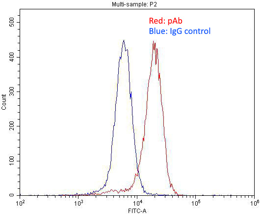 1X10^6 SH-SY5Y cells were stained with 0.2ug GABRA1 antibody (Catalog No:110807, red) and control antibody (blue). Fixed with 4% PFA blocked with 3% BSA (30 min). Alexa Fluor 488-congugated AffiniPure Goat Anti-Rabbit IgG(H+L) with dilution 1:1500.