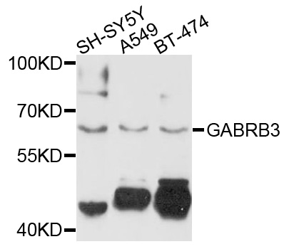 Western blot analysis of extracts of various cell lines, using GABRB3 antibody at 1:1000 dilution.Secondary antibody: HRP Goat Anti-Rabbit IgG (H+L) at 1:10000 dilution.Lysates/proteins: 25ug per lane.Blocking buffer: 3% nonfat dry milk in TBST.Detection: ECL Basic Kit .Exposure time: 60s.