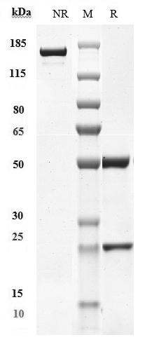 Anti-Amyloid Beta Antibody (gantenerumab) on SDS-PAGE under reducing (R) condition. The purity of the protein is greater than 90%.