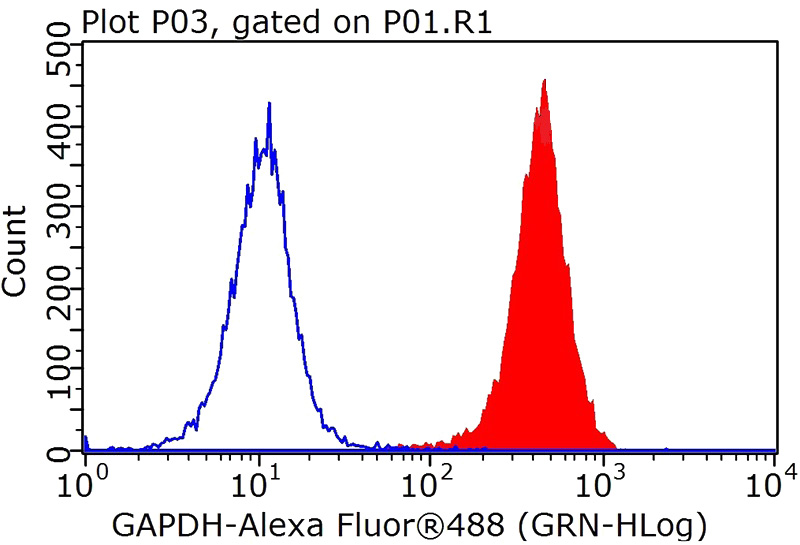 1X10^6 HEK-293 cells were stained with .2ug GAPDH antibody (Catalog No:117317, red) and control antibody (blue). Fixed with 90% MeOH blocked with 3% BSA (30 min). Alexa Fluor 488 -Goat anti-Rabbit IgG with dilution 1:100.
