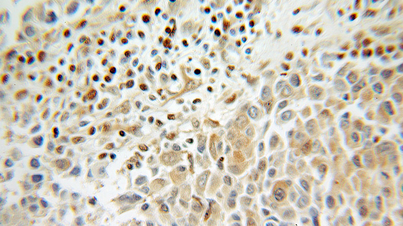Immunohistochemical of paraffin-embedded human breast cancer using Catalog No:117317(GAPDH antibody) at dilution of 1:100 (under 10x lens)