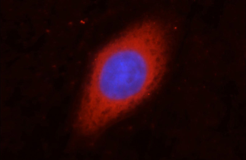 Immunofluorescent analysis of HepG2 cells, using GAPDH antibody Catalog No:117317 at 1:50 dilution and Rhodamine-labeled goat anti-rabbit IgG (red). Blue pseudocolor = DAPI (fluorescent DNA dye).