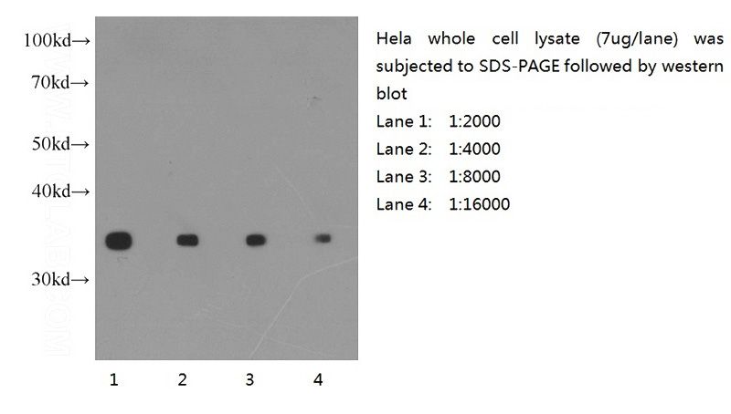 Western blot of Hela cell with anti-GAPDH (Catalog No:117317) at various dilutions.