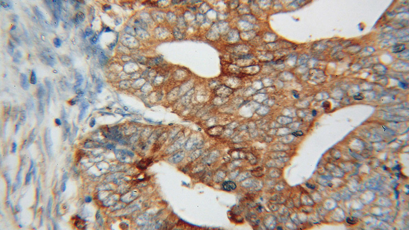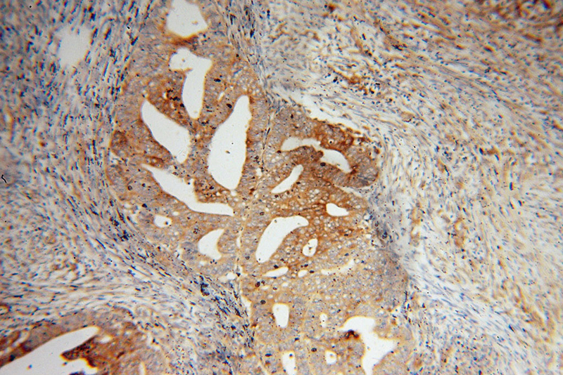 Immunohistochemical of paraffin-embedded human endometrial cancer using Catalog No:110891(GBP1 antibody) at dilution of 1:50 (under 10x lens)