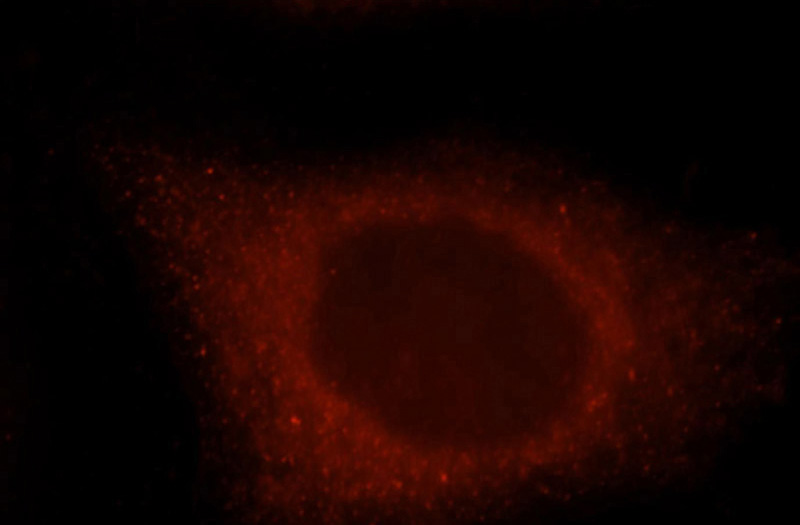 Immunofluorescent analysis of MCF-7 cells, using GBP1 antibody Catalog No:110891 at 1:25 dilution and Rhodamine-labeled goat anti-rabbit IgG (red).