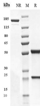 Anti-Siglec-3 / CD33 Antibody (Gemtuzumab ozogamicin) on SDS-PAGE under reducing (R) condition. The purity of the protein is greater than 90%.