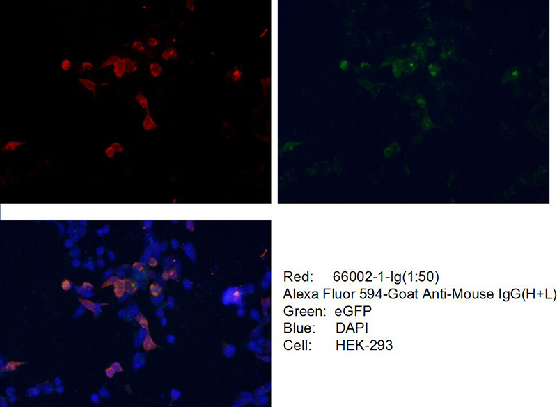 Immunofluorescent analysis of Transfected HEK-293 cells using Catalog No:117318(GFP tag Antibody) at dilution of 1:50 and Alexa Fluor 488-congugated AffiniPure Goat Anti-Mouse IgG(H+L)