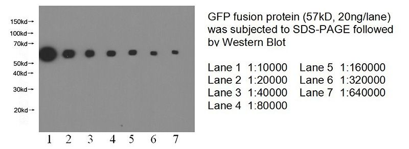 WB result of eGFP fusion protein with anti-eGFP tag(Catalog No:117318) with GFP fusion protein at varous dilutions.