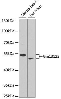 Antigen: Recombinant fusion protein containing a sequence corresponding to amino acids 1-477 of mouse Gm13125 (NP_001108549.1).