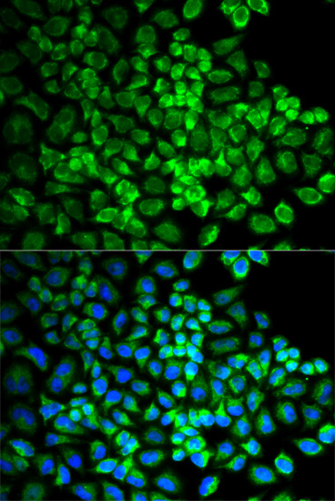 Immunofluorescence analysis of U2OS cells using GRIA3 antibody . Blue: DAPI for nuclear staining.