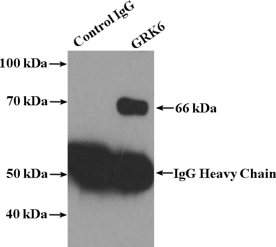 IP Result of anti-GRK6 (IP:Catalog No:111215, 4ug; Detection:Catalog No:111215 1:500) with HEK-293 cells lysate 1120ug.