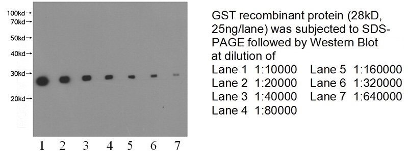 Protein tags are protein or peptide sequences located either on the C- or N- terminal of the target protein, which facilitates one or several of the following characteristics: solubility, detection, purification, localization and expression. GST(Glutathione S-Transferase) is a widely used protein tag encoded by the Schistosoma japonicum. GST provides both an easily detectable tag and a simple purification process with little effect on the biological function of the protein of interest. Antibodies to GST are useful for checking protein expression both in plaques and on Western blots as well as for immunoaffinity purification of proteins expressed in cells. This antibody recognizes the GST-tag fused to either the amino- or carboxy-terminus of targeted proteins.
