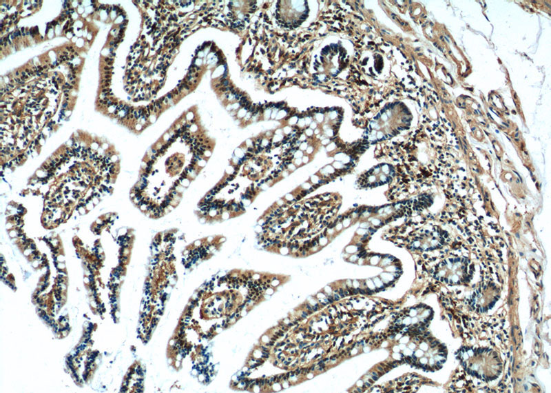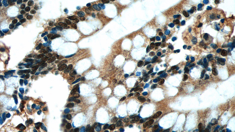 Immunohistochemistry of paraffin-embedded human small intestine tissue slide using Catalog No:111497(HNF4G Antibody) at dilution of 1:50 (under 40x lens)
