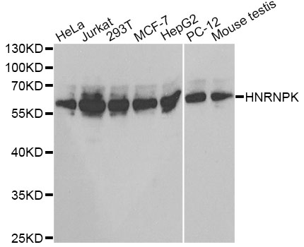 Western blot analysis of extracts of various cell lines, using HNRNPK antibody at 1:1000 dilution.Secondary antibody: HRP Goat Anti-Rabbit IgG (H+L) at 1:10000 dilution.Lysates/proteins: 25ug per lane.Blocking buffer: 3% nonfat dry milk in TBST.