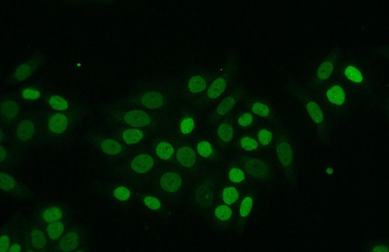 Immunofluorescent analysis of HeLa cells using Catalog No:111512(HNRNPU Antibody) at dilution of 1:50 and Alexa Fluor 488-congugated AffiniPure Goat Anti-Rabbit IgG(H+L)