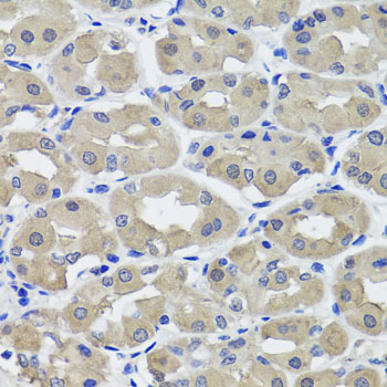 Immunohistochemistry of paraffin-embedded human stomach using HSD11B2 antibody at dilution of 1:100 (40x lens).