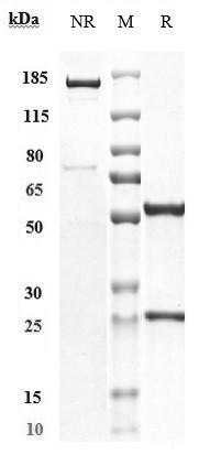 Anti-CD4 Antibody (ibalizumab) on SDS-PAGE under reducing (R) condition. The purity of the protein is greater than 95%.