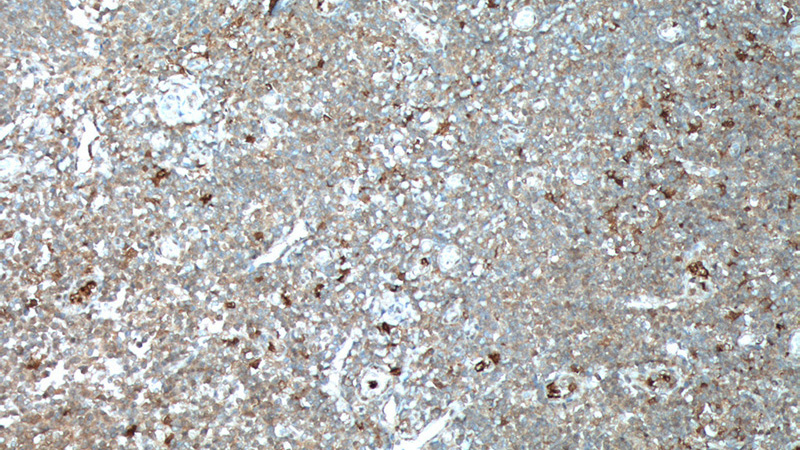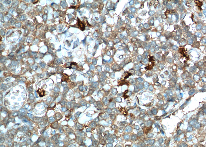 Immunohistochemistry of paraffin-embedded human tonsillitis tissue slide using Catalog No:111610(IDO1 Antibody) at dilution of 1:100 (under 40x lens). heat mediated antigen retrieved with Tris-EDTA buffer(pH9).