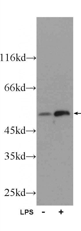 LPS treated RAW 264.7 cells were subjected to SDS PAGE followed by western blot with Catalog No:111617(IFIT1 Antibody) at dilution of 1:600