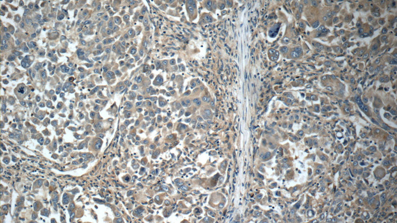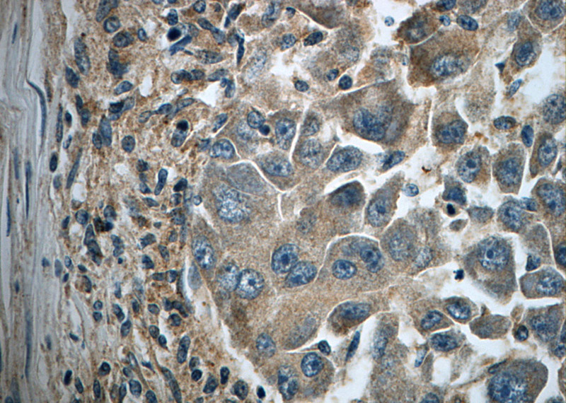 Immunohistochemistry of paraffin-embedded human liver cancer slide using Catalog No:111617(IFIT1 Antibody) at dilution of 1:50